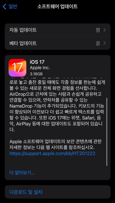 업데이트 절차: 설정 앱-> 일반-> 소프트웨어 업데이트-> 업데이트 다운로드 및 설치