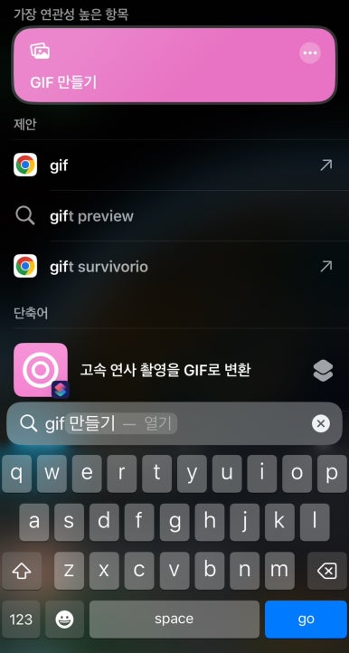 제가 정말 잘 사용하는 기능인 스팟라이트 기능은 이제 검색을 하면 단축어 앱에서 사용 가능한 기능으로 바로 연결이 가능해졌어요! 저는 단축어 앱으로 gif도 만들고, 배경화면 꾸미기(앱 아이콘 이미지 바꾸기 등)도 잘 하는데 저렇게 검색해서 잘쓰는 기능으로 바로 갈 수 있고, 몰랐던 기능도 더 찾아볼 수있어서 너무 좋아요 ?