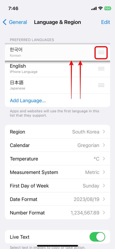 1. 선호하는 언어 항목에서 원하는 언어 오른쪽의 세줄 아이콘을 드래그하여 가장 위로 이동한다.