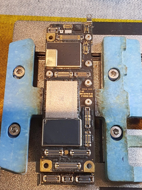 아이폰데이터복구를 위해서 메인보드를 적출한 사진입니다. 사진상으로 보아도 하단의 메인보드가 휘어져있고 수많은 연결점접이 떨어져있는것을 확인할 수 있습니다. 상,하단을 이어주는 Interposer방식의 메인보드는 공간을 절약할 수 있지만 반대로 충격에는 약할 수 밖에 없는 구조입니다