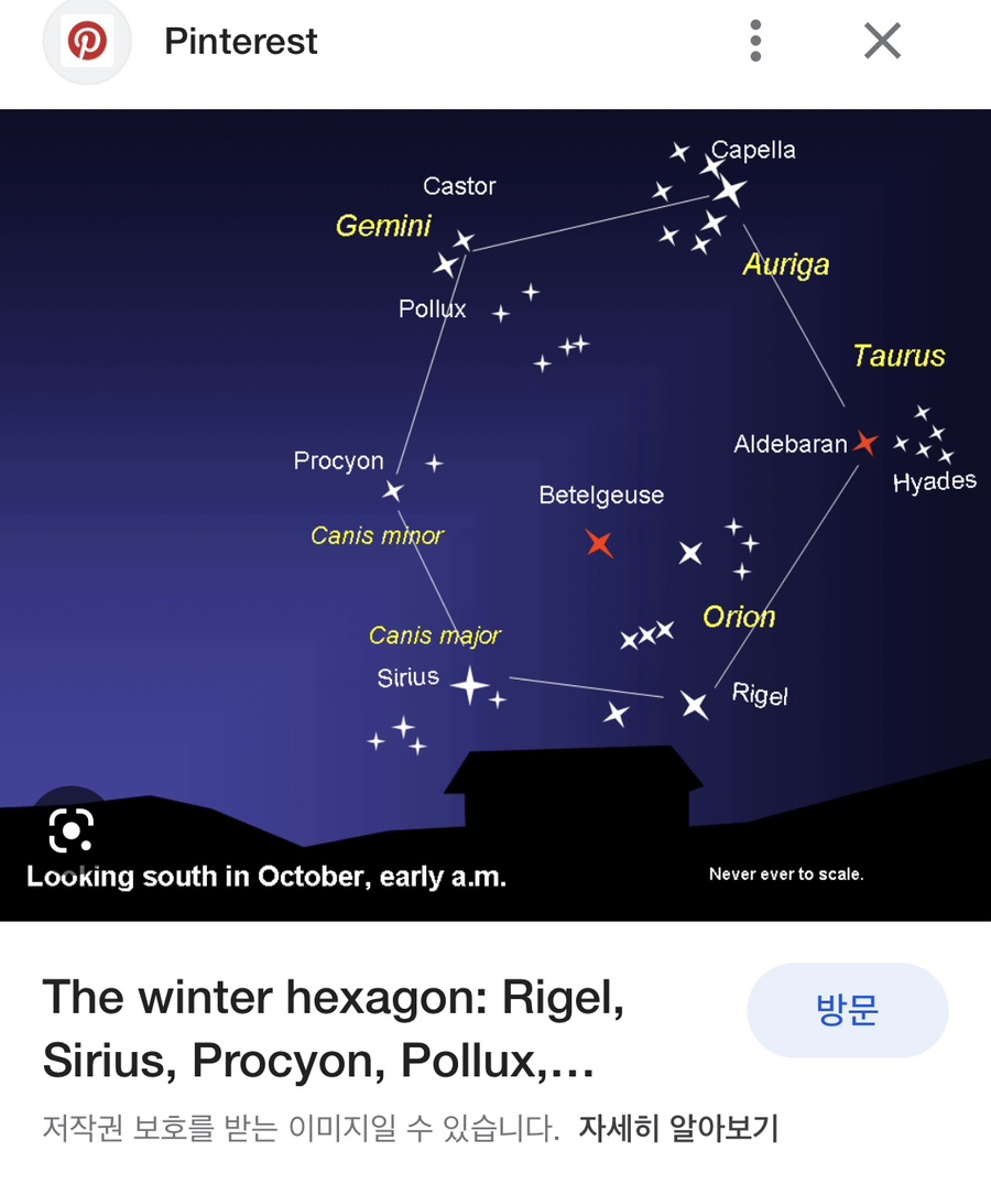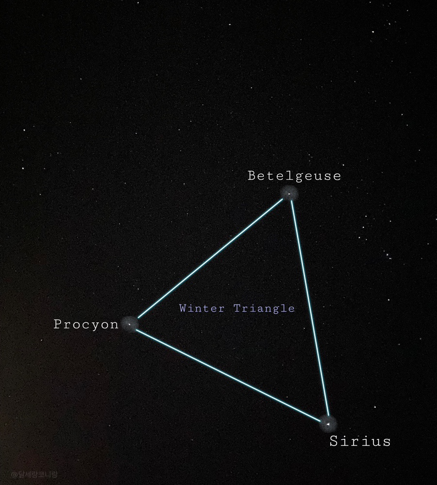 베텔게우스(Betelgeuse), 시리우스(Sirius), 프로키온(Procyon) 이 셋이 #겨울철대삼각형 을 이룬다.ㅎㅎㅎ