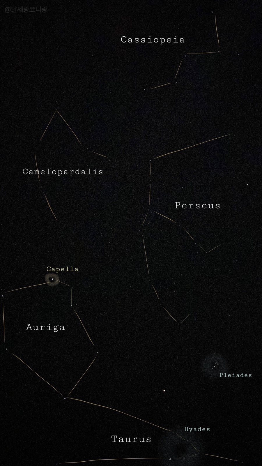 사진은 거꾸로 돌려보니 이미 익힌 황소자리(Taurus)쪽의 성단들이 보였다. 거기서부터 올라가면서 마차부자리(Auriga), 페르세우스자리(Perseus), 기린자리(Camelopardalis) 하나씩 찾아서 그려보니