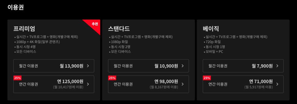 국내 OTT 서비스의 경우, 결제 수단에 따라 10~20% 정도 가격 차이가 나네요.