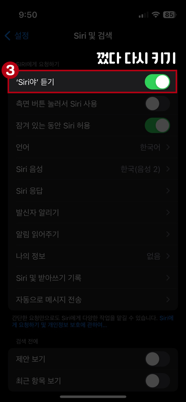3. ['Siri야', 듣기] 버튼을 껐다가 다시 켜주시기 바랍니다