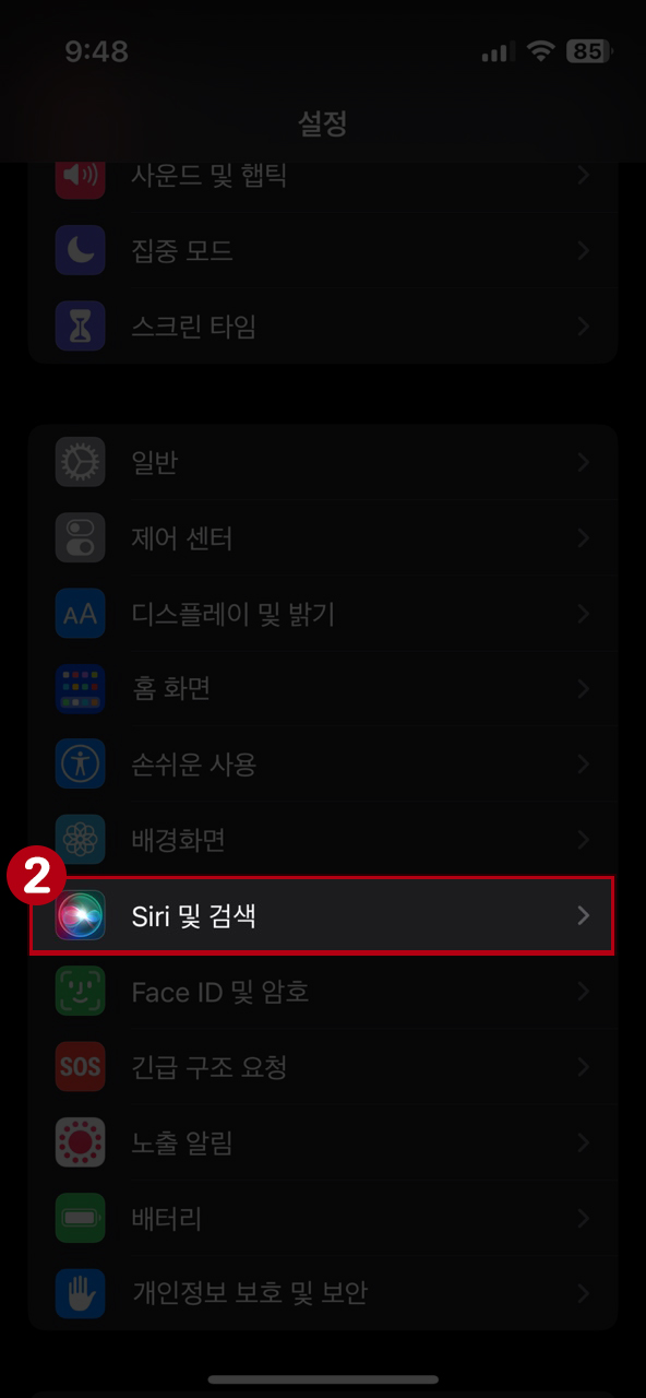 2. [Siri 및 검색] 버튼을 클릭해주세요