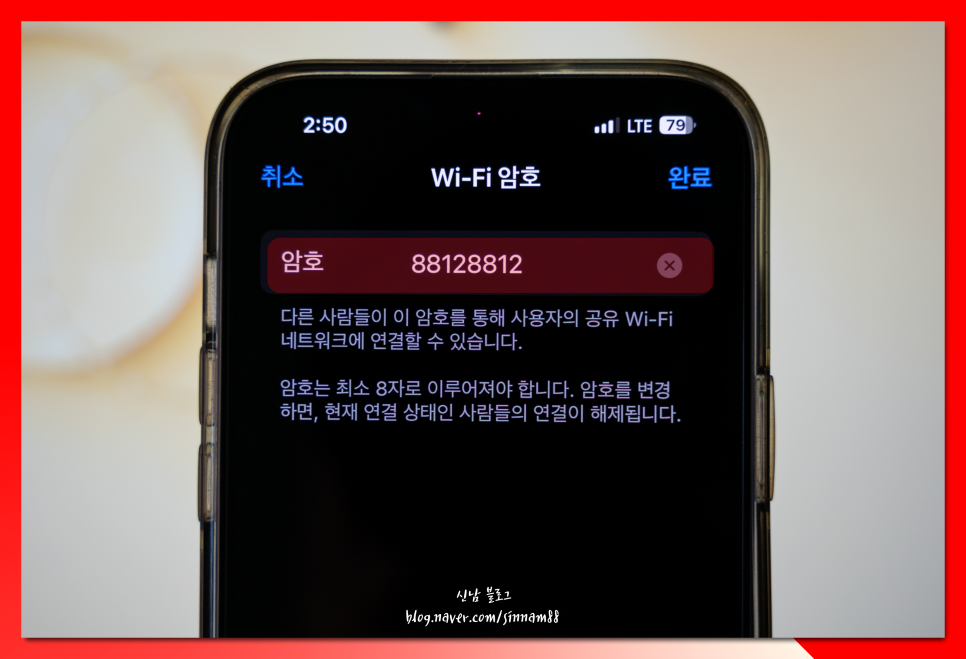 5. 암호는 최소 8글자로 숫자로만 만들어둬도 되고요.언제든 바꿀 수 있는데 주의할 점으로 바꾸게 되면 이전에 연결해놨던 기기들에선 wifi가 끊기게 됩니다.