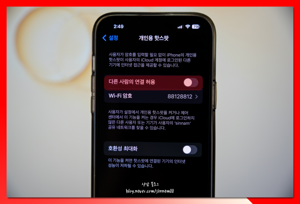3. <다른 사람의 연결 허용>을 체크하면 저의 스마트폰으로 암호를 가지고 있는 사람이라면 누구나 접속하여 wifi를 이용할 수 있도록 설정할 수 있습니다.