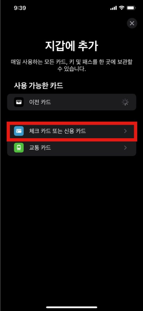 그 후 카드 추가 > 체크 카드 또는 신용 카드 버튼을 눌러주세요.