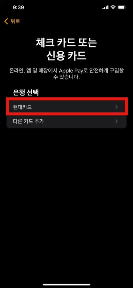 현대카드 앱을 사용해서 사용자의 Apple Pay에 카드를 추가할 수 있습니다.