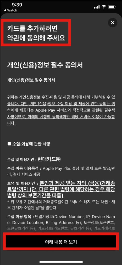 애플 페이에 추가할 현대 카드를 선택한 뒤, 약관을 확인한 후 동의해 주세요.